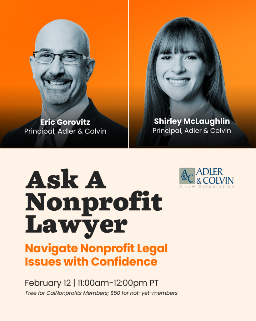 We’re bringing together two of the state’s most experienced nonprofit legal minds for a practical, accessible deep dive into the legal issues every organization should understand. Experts Eric Gorovitz and Shirley McLaughlin, both principals at the nationally recognized law firm Adler & Colvin, will walk through key legal fundamentals and answer your most pressing questions.